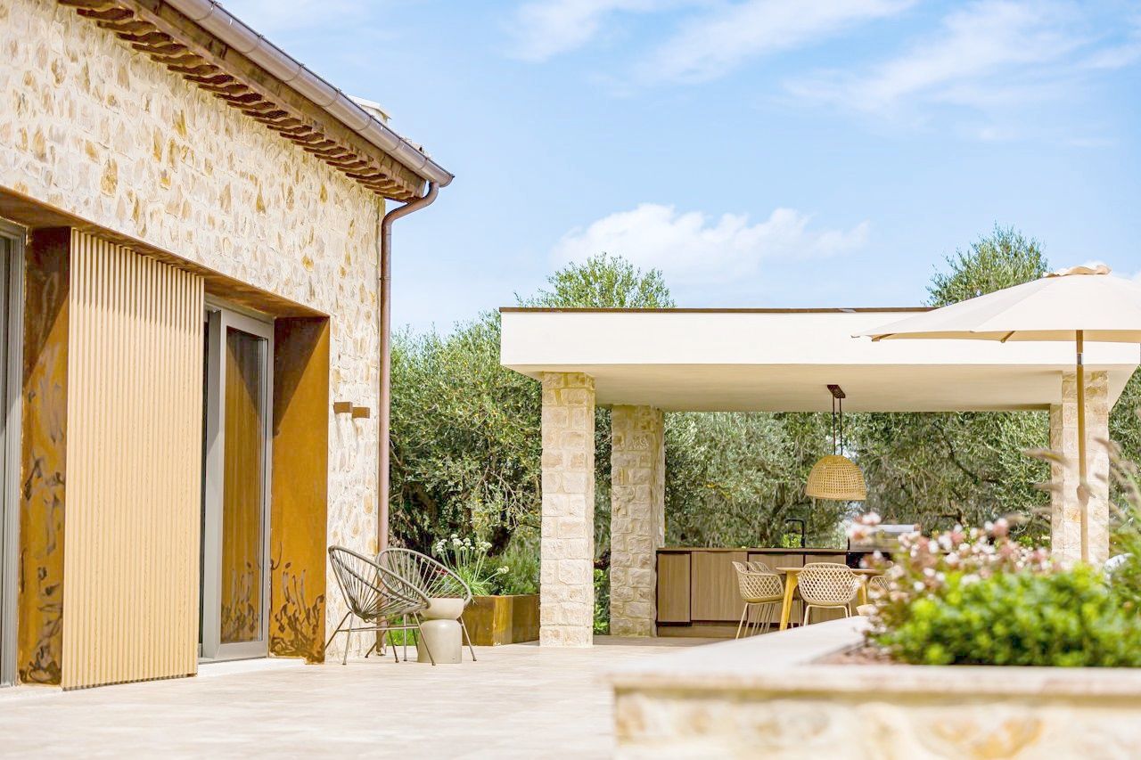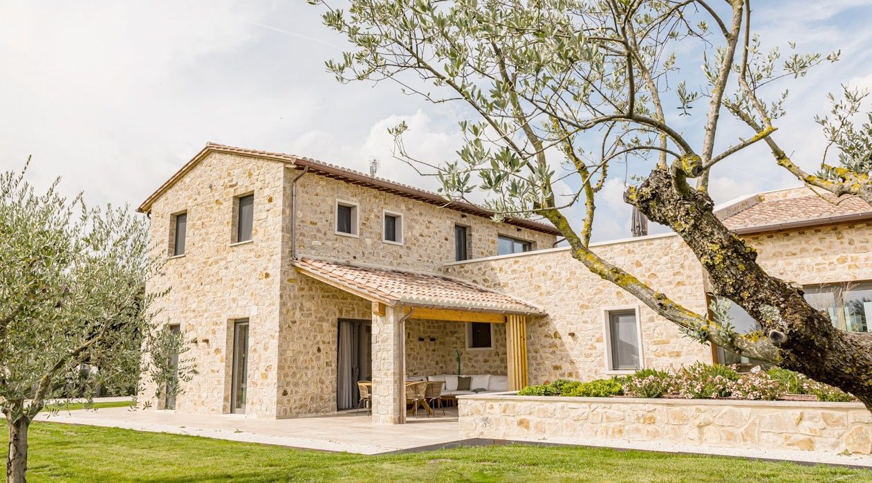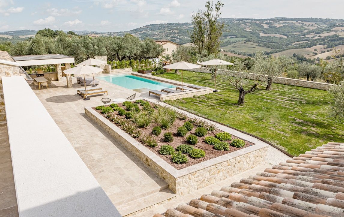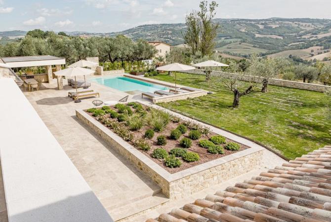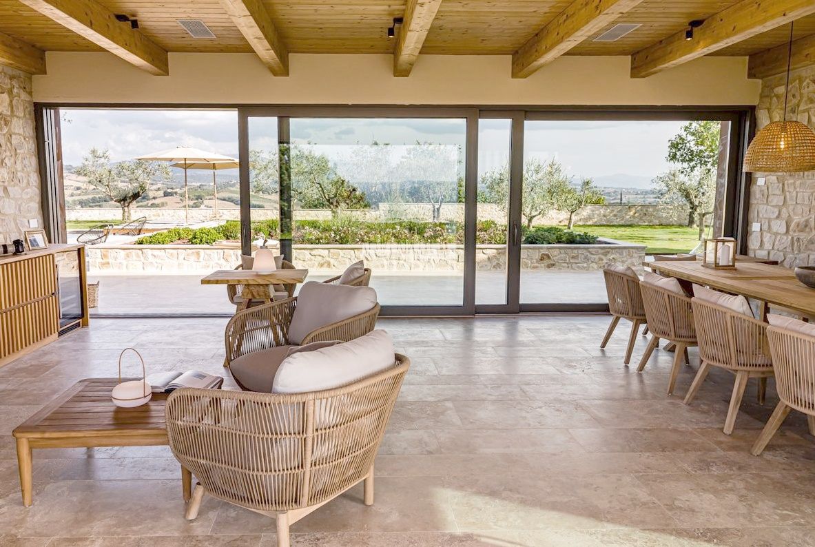 Villa Il Momento is located on the top of a hill overlooking the region of Todi. This newly built villa was designed to incorporate traditional architecture like the stone exposed outside and wooden beams with modern design such as floor to ceiling windows to create a light and airy feel.
