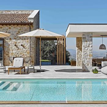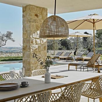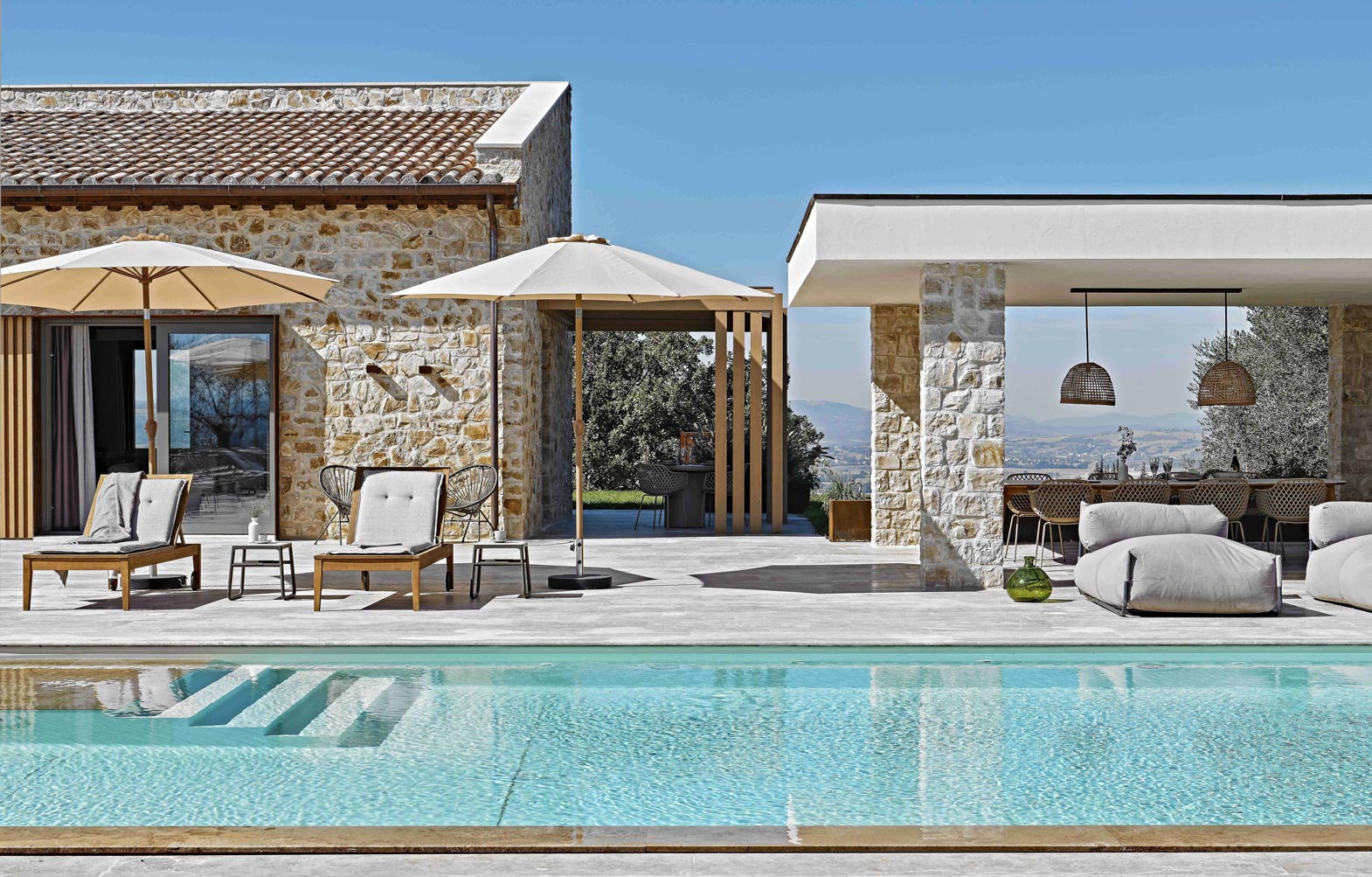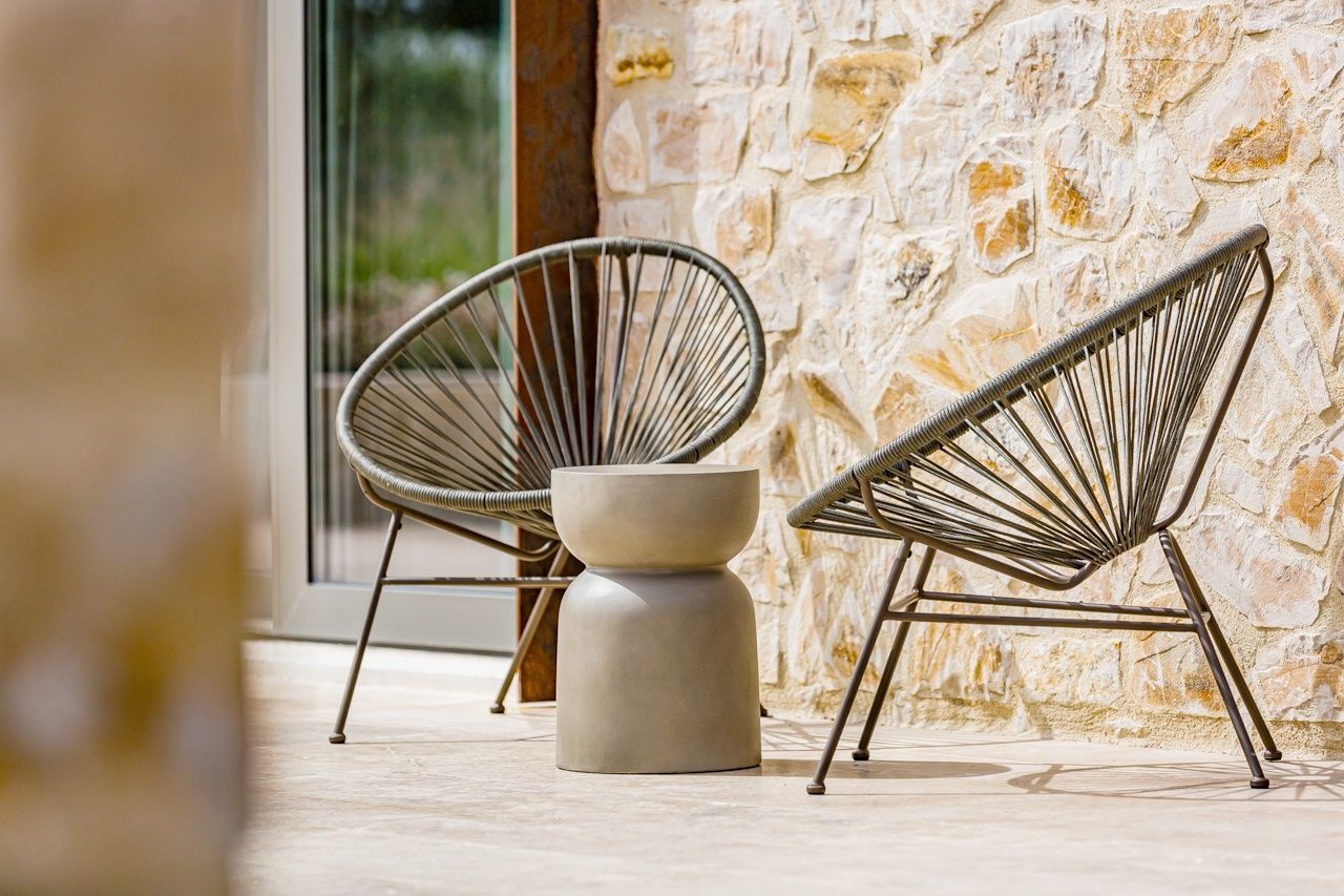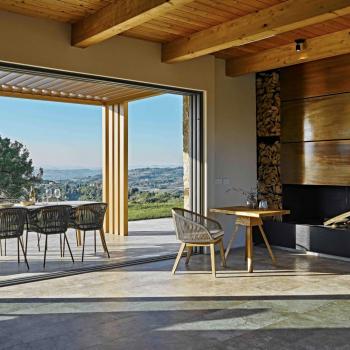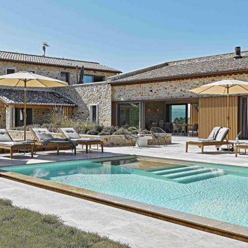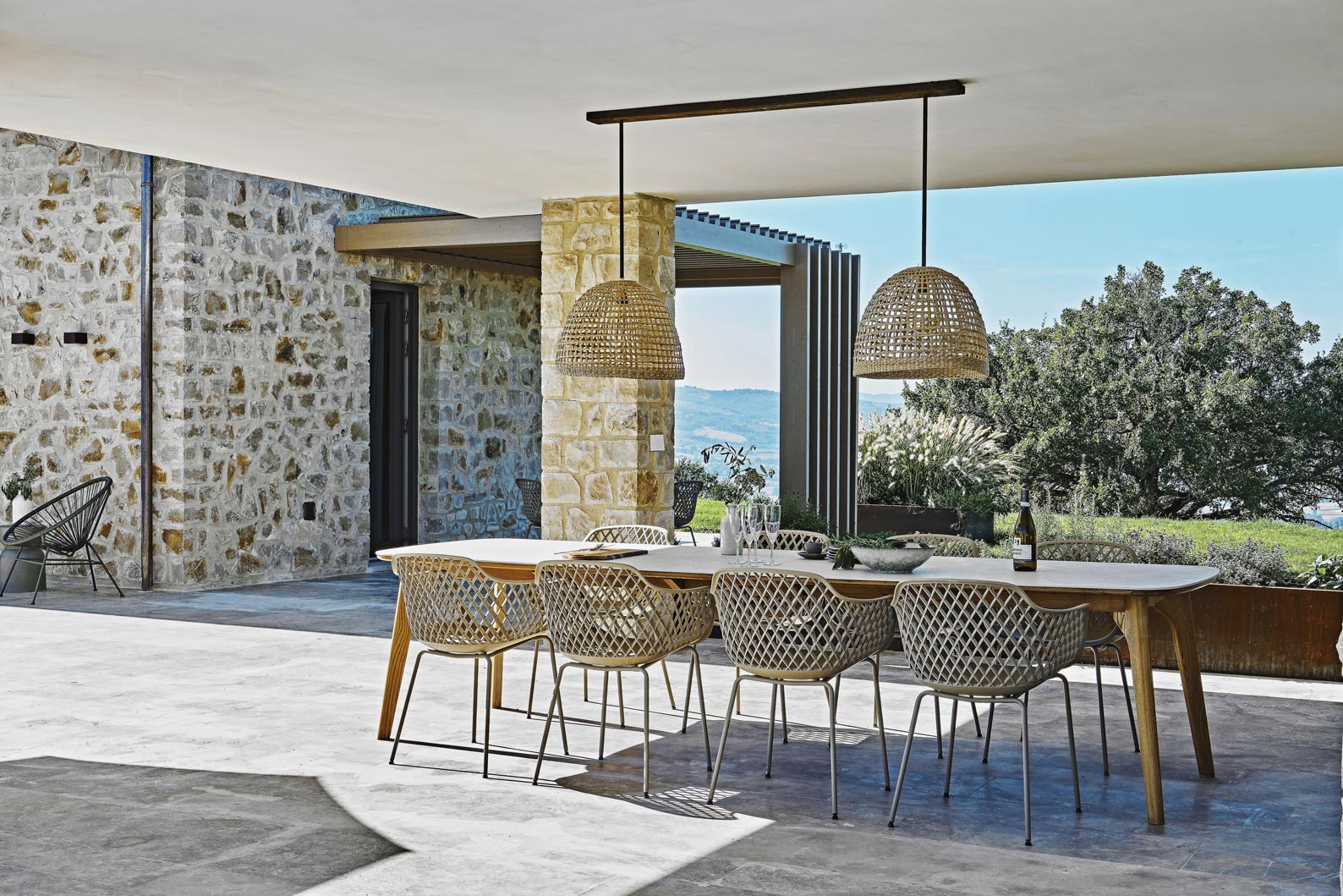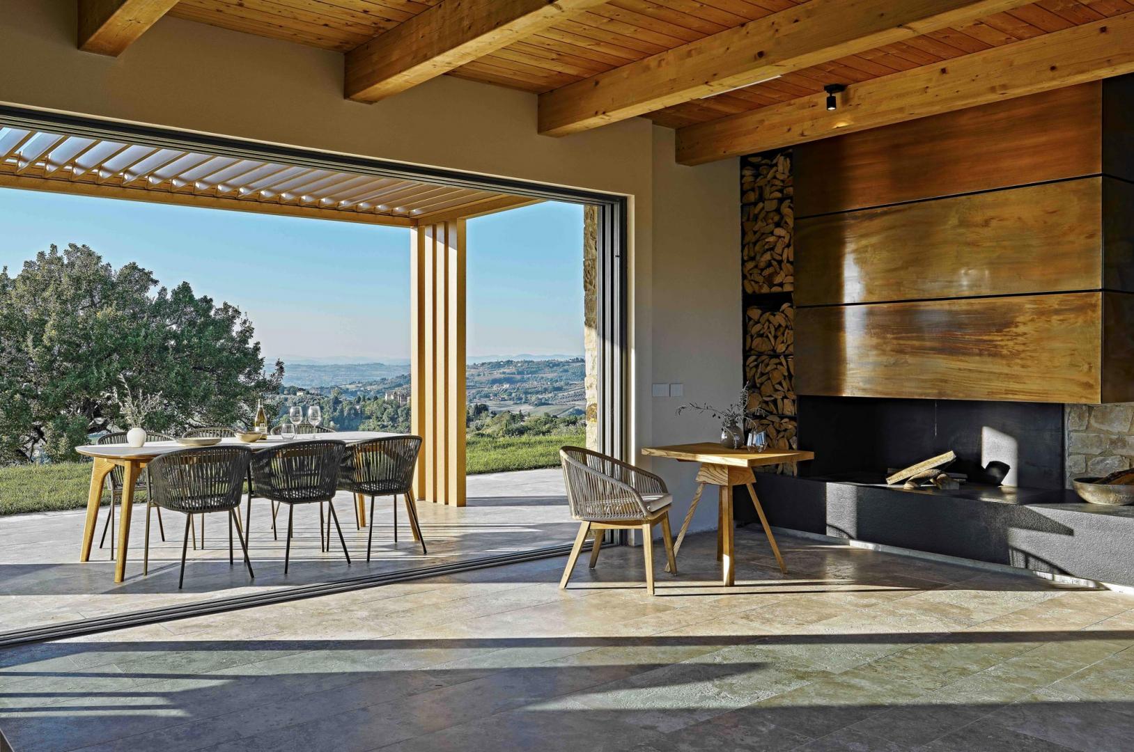 One noteworthy aspect of this charming villa is 'The Greenhouse' – a communal space with panoramic views and large sliding doors for an indoor-outdoor feel. Ideal for shared meals with your loved ones - it includes a wooden dining table, armchairs, fireplace, air conditioning and a wine fridge.